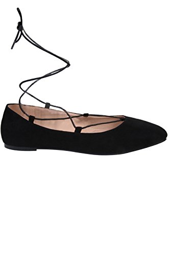 E fit black ballerina pumps with pointed toe finish. Features easily adjustable lace up ankle strap. Made from a soft faux suede these are a must have this season. Wear with a cute dress and floppy hat for an on trend look.